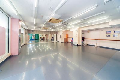 バス停前、駅近、床はリノリューム使用、清潔なダンススタジオ、集会、会議にも